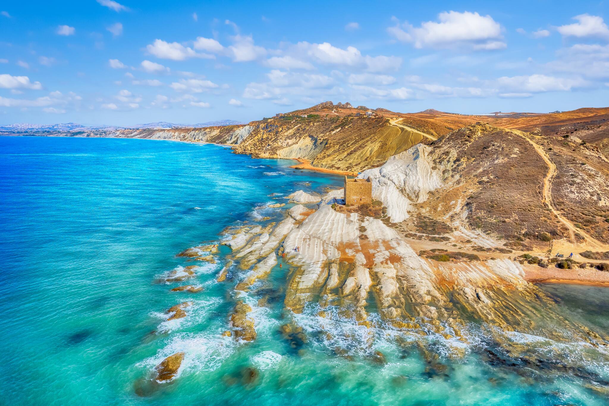 Bei Realmonte im Inselsüden steht ein Monument aus Mergel, geschaffen von den Launen der Natur. Der unverwechselbare Felsen erhebt sich strahlend weiß und in kleinen Wellen und Stufen vor dem hellen Blau des Meeres, fast sieht er aus wie ein Eisberg.
